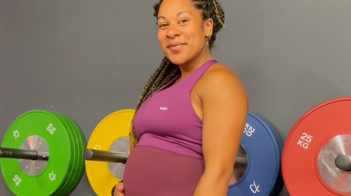 “From the beginning of my pregnancy, my pelvis has been relatively sore, so I‘ve had to adjust some movements of my lower body routine. I am making sure to do yoga at least once per week and then a minimum of three other sessions in that week. I’m now doing much lighter, high-rep typical ‘bodybuilding’ split sessions rather than strength-based work.”