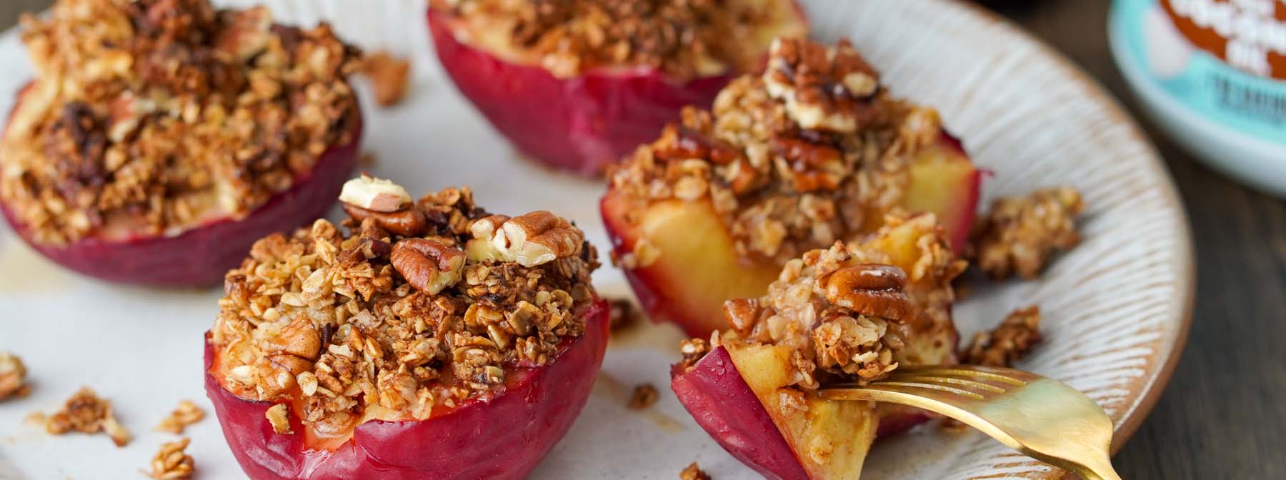 Cut the apples in half through the stem, remove the core with a spoon, and fill the hollowed apple halves with the oat mixture.