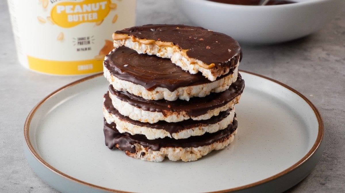 Spread 1 tablespoon of peanut butter on each rice cake and dip into the melted chocolate. Add a sprinkle of flaked salt.