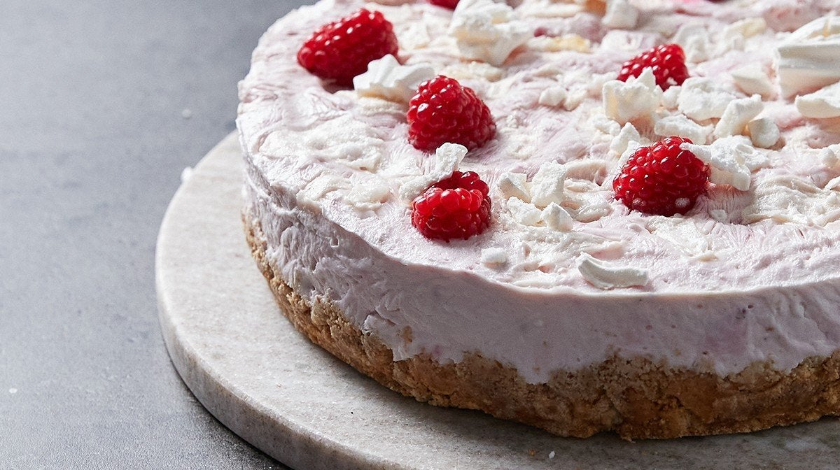 In a large bowl, add the yoghurt, Eton mess flavoured whey protein, and 100g of raspberries (keep some aside to top the cheesecake with later). Use a hand blender to blitz everything together into a smooth mixture and then pour this on top of your biscuit base. - Use a spatula to smooth the cheesecake filling evenly across the base, then crumble one of the meringues over the top. Place the remaining raspberries on top and then freeze for at least 4 hours (preferably overnight).