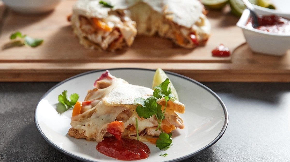 - Next, prepare your baking tin to start building the layers by adding the first tortilla wrap to the bottom. Add a third of the chicken mixture on top of the wrap, making sure it’s evenly spread across, then sprinkle with a third of the grated mozzarella and cover with a second tortilla wrap.