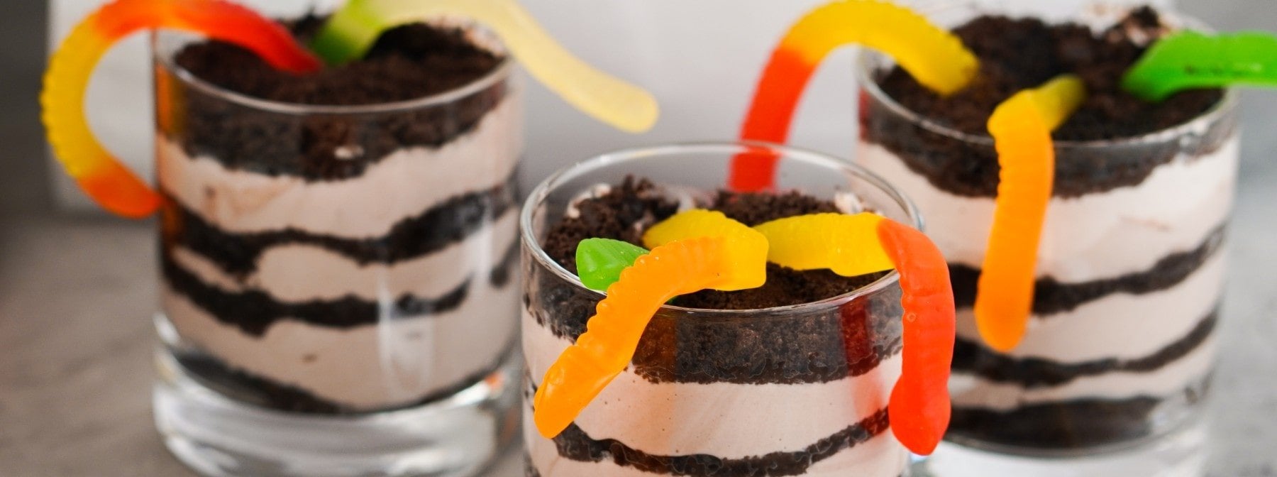 Now, it’s time to assemble. Alternate layers of crumbled cookies and yoghurt mix in a tumbler-style glass. Make sure that the last layer is made of the crumbled cookies, as this will be the “mud” for the worms.