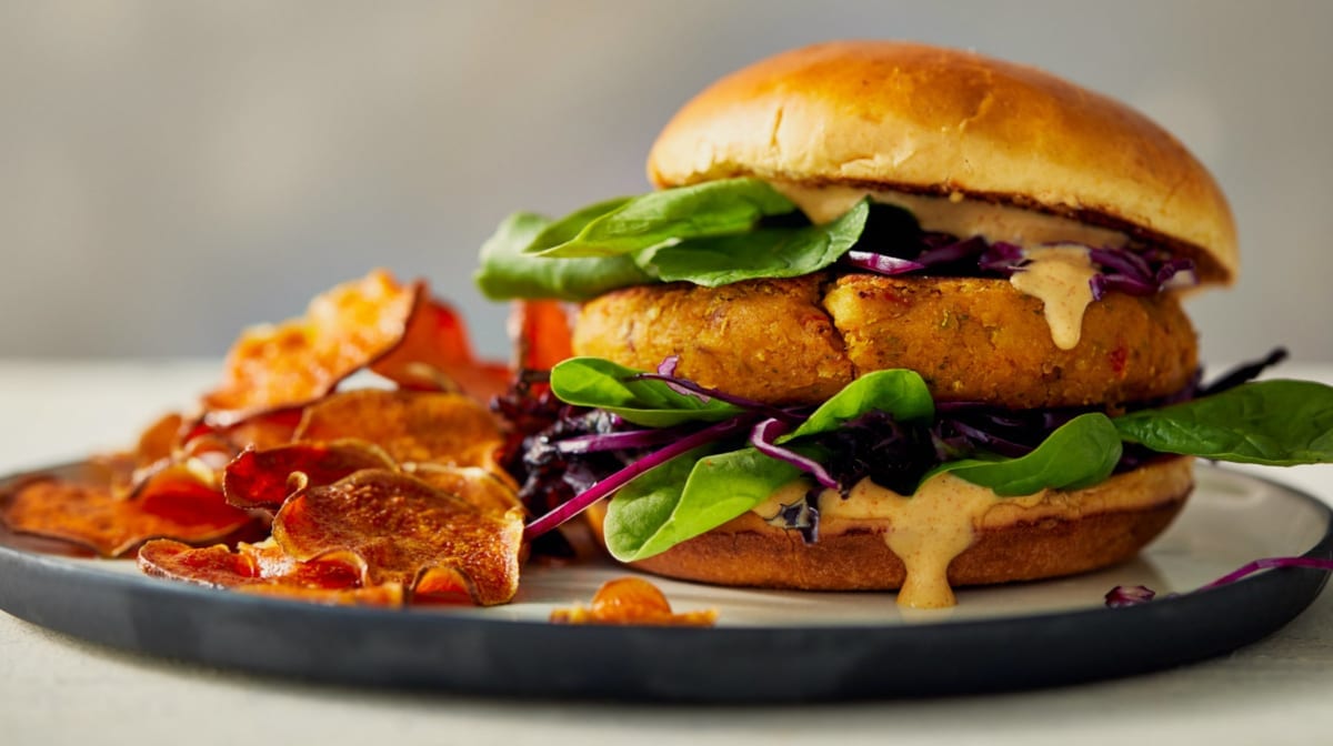 These spicy chickpea burgers are packed with flavour from coriander, garlic, sundried tomatoes and hummus. Smothered with a low-sugar sweet chilli mayo sauce (that's suitable for vegans, too) and crunchy shredded purple cabbage, this burger isn't just healthy – it's super-satisfying, too.