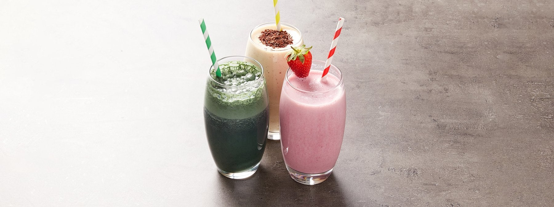 1) For each smoothie flavour, simply add the ingredients to a blender and blend until the mixture is fully combined in a thick, smooth liquid.