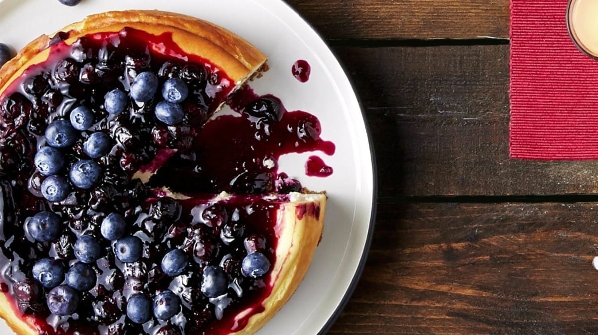 7. Once the protein cheesecake and coulis are completely cool, remove the cheesecake from the tin and pour the blueberry coulis over the top. Eat immediately or cover and refrigerate for up to 5 days.