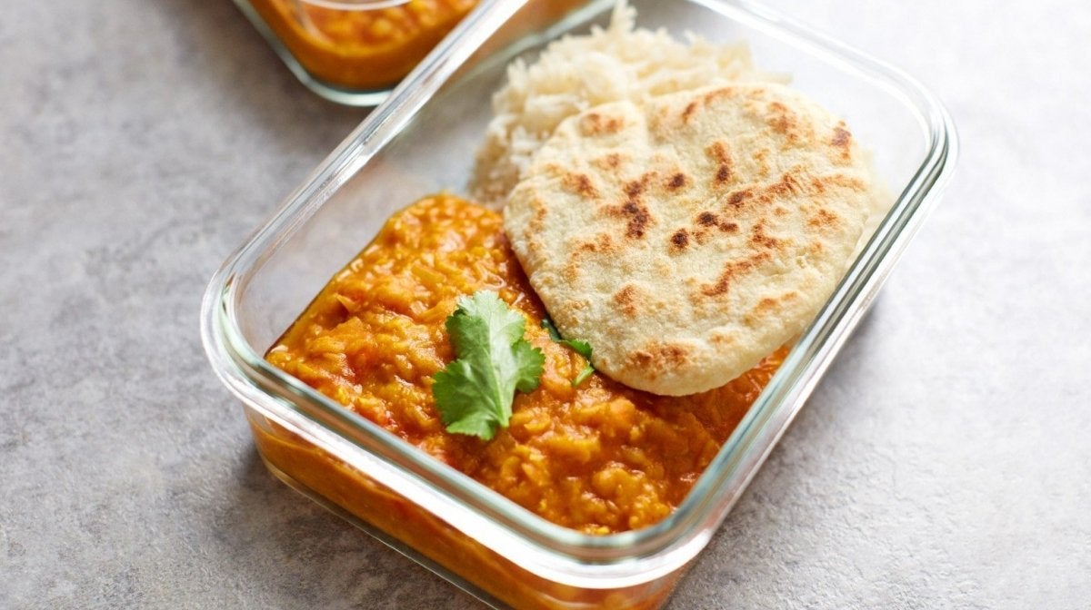 Once your one-pot lentil dahl has cooked, stir well and then portion up with rice into meal prep containers. Add a mini naan to each one and garnish with coriander.