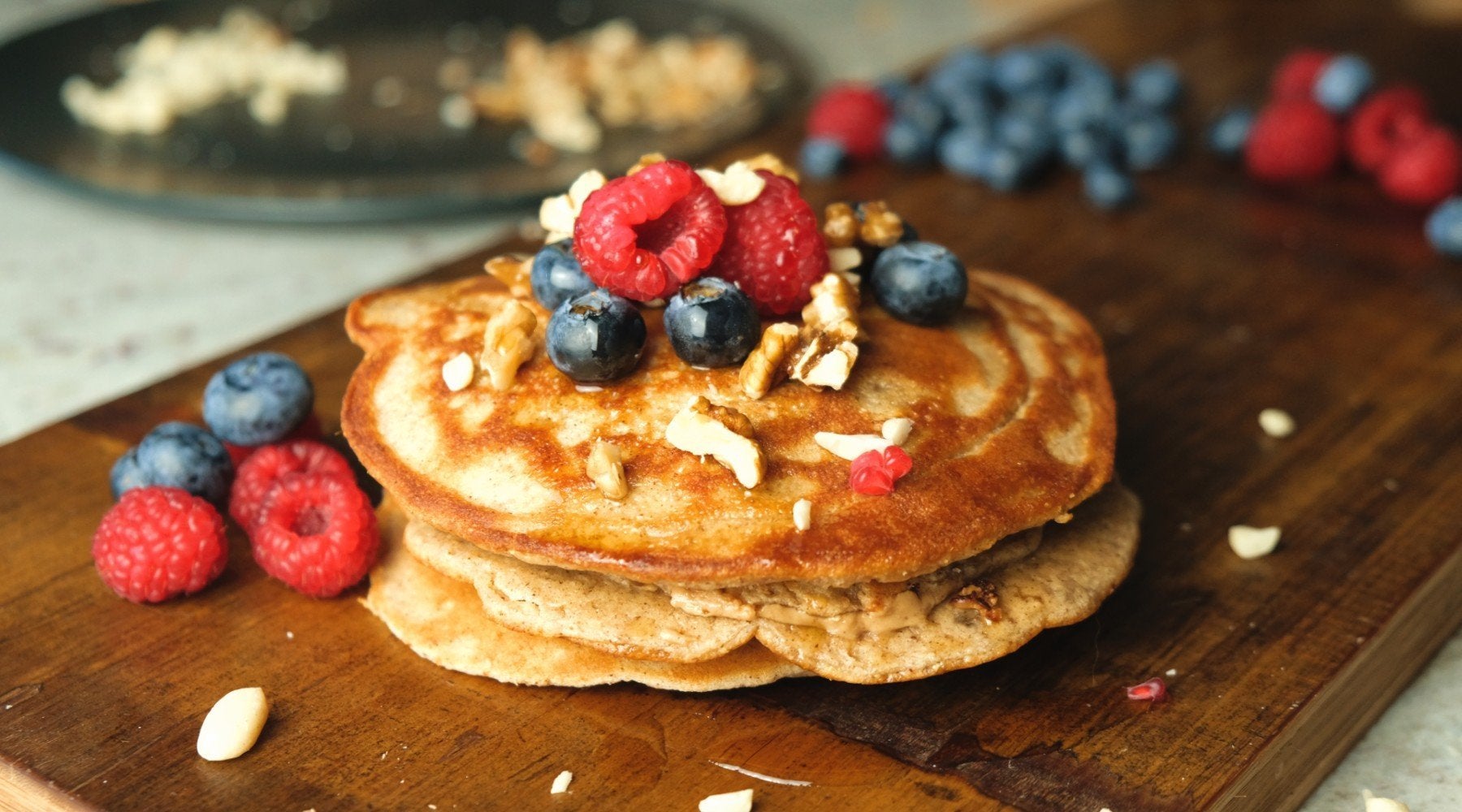 Stack your pancakes and top with your favourite toppings — we recommend a handful of berries, chopped nuts, and a drizzle of Sugar-Free Syrup.