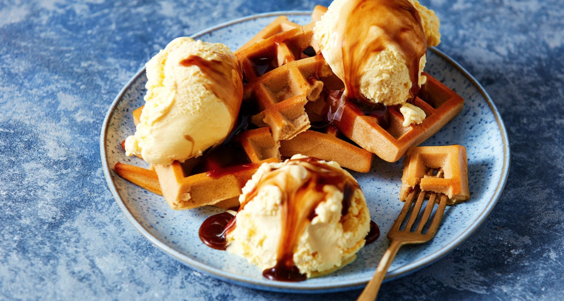 2. When the ice cream is nearly set, it’s time to make your protein waffles! Whisk Protein Pancake Mix with 100ml milk and melted coconut oil until no lumps remain. Pour batter into a silicone waffle mould (or use a waffle iron if you own one). If using a silicone waffle mould, place a tray with a weight on top (like an oven-safe dish) so the waffles don’t rise.