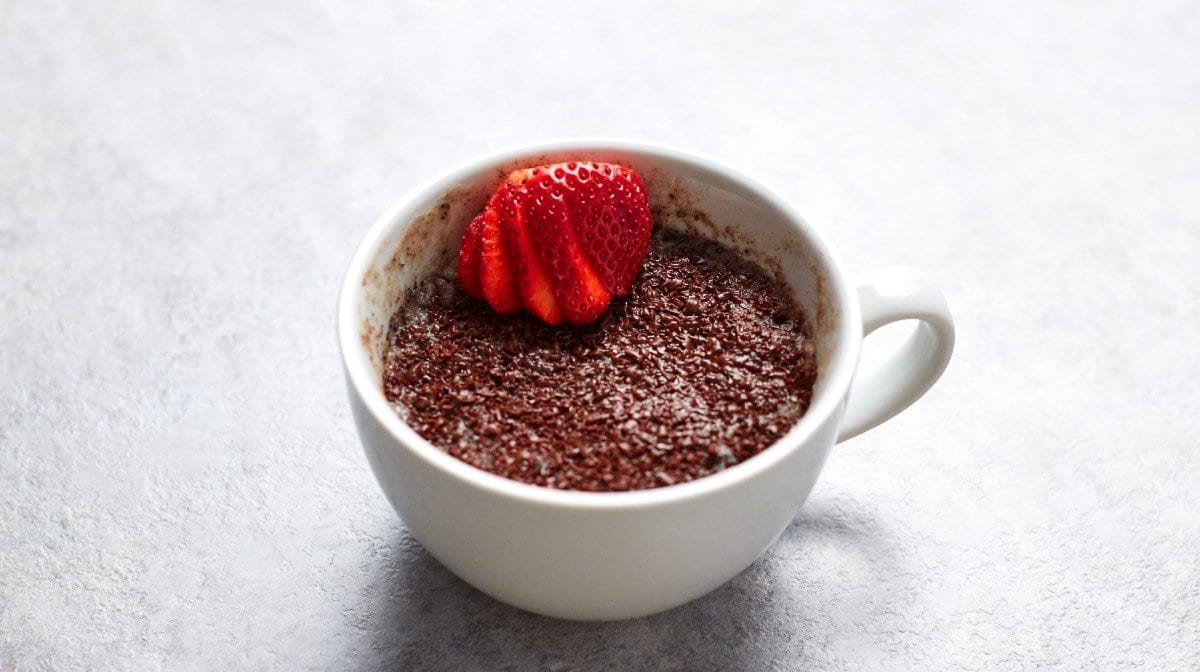 - Remove from the microwave and let cool for at least two or three minutes before eating. Garnish with grated chocolate and a sliced strawberry to top it all off, then dig in.
