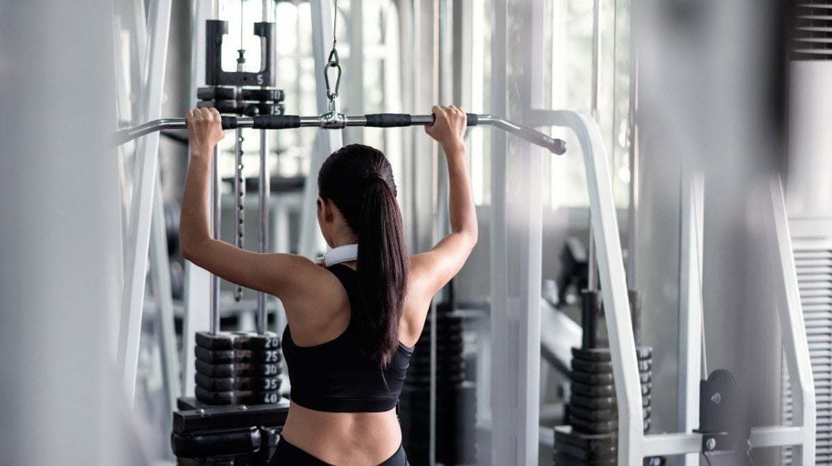 - Sit on the lat pulldown machine and adjust the knee pad so that there is no free space and you’re seated tightly.