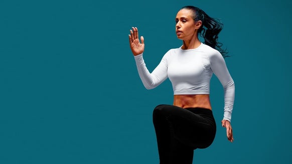 Stand upright, feet together, and take a big lunge forward with your right leg, lowering your hips toward the floor. Bend both knees to 90-degree angles. The back knee should point toward but not touch the floor, and your front knee should be directly over the ankle. Push back upwards and repeat for the other leg. Keep the core tight and upper body stable and upright.